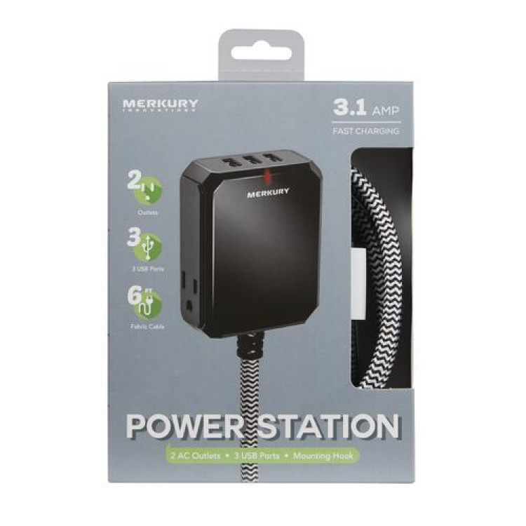 AC and USB power in a single power block. The end power block has 2AC outlets and 3 USB A power ports, the power cable is 6 feet long ending with a right angle AC plug.